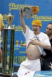 Though Chestnut jumped out to an early lead in the competition, it was 160 pound Takeru Kobayashi who prevailed when he passed Chestnut with about three minutes left in the contest. Mazal tov! Takeru is champion hotdog eater again.